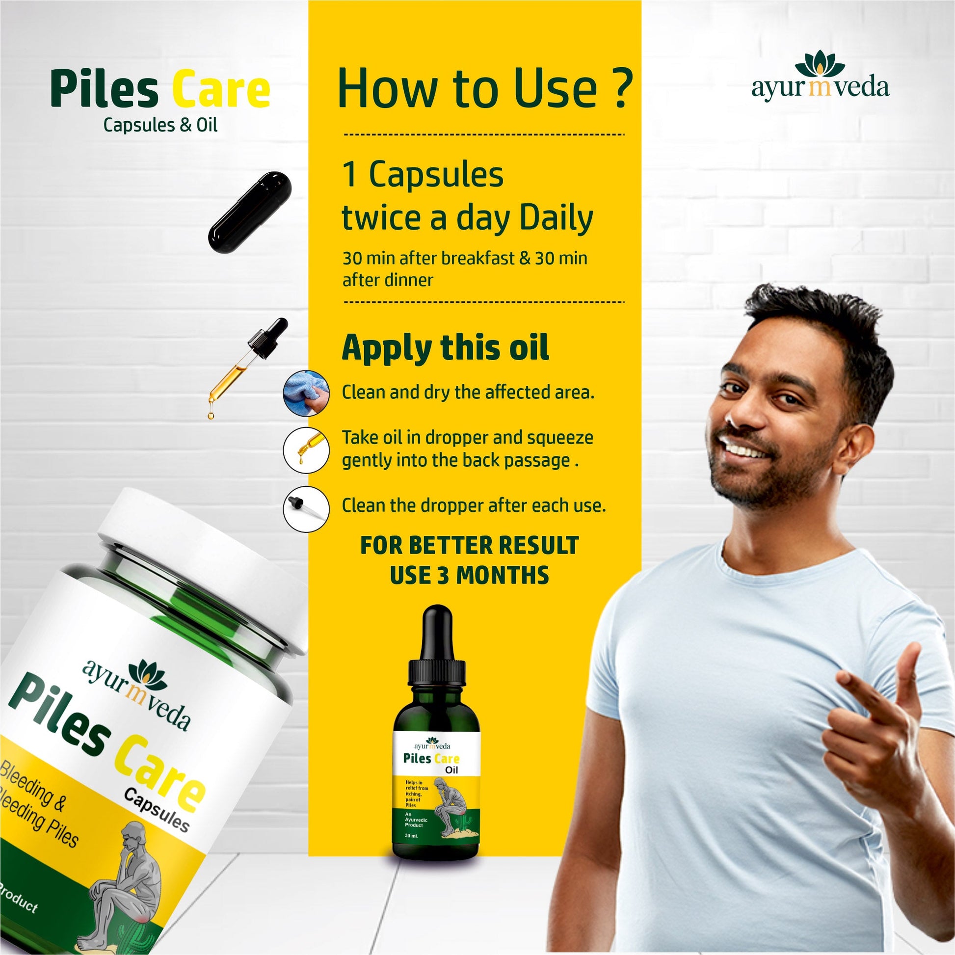 Take 1 capsule twice a day (after meals) and apply the oil twice daily to the affected area.